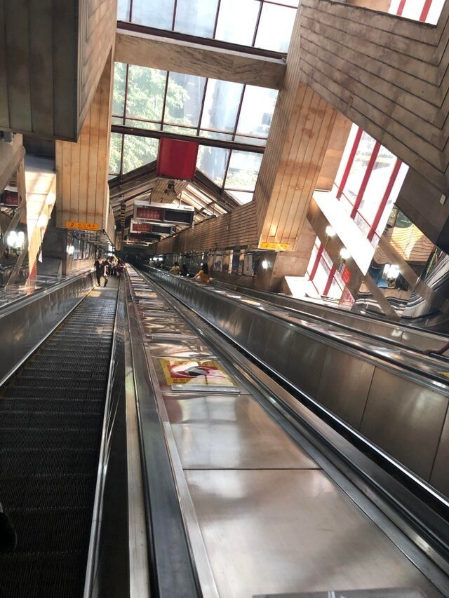 Очень длинный эскалатор на станции метро в Чунцине, Китай