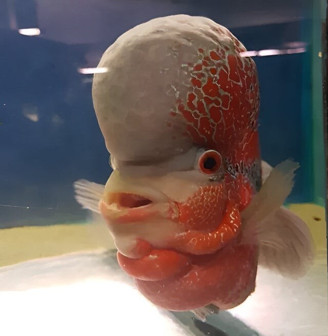Цветочная цихлида, похожа на мультяшного злодея