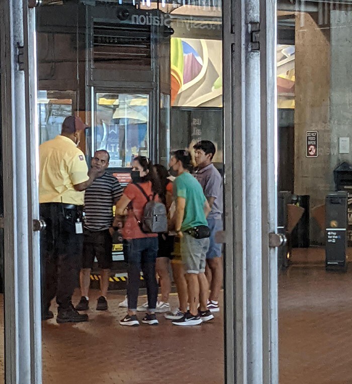 Служба охраны делает выговор туристам за то, что они нажали кнопку экстренной остановки на эскалаторе метро, чтобы сделать селфи