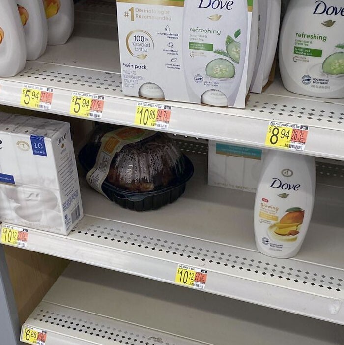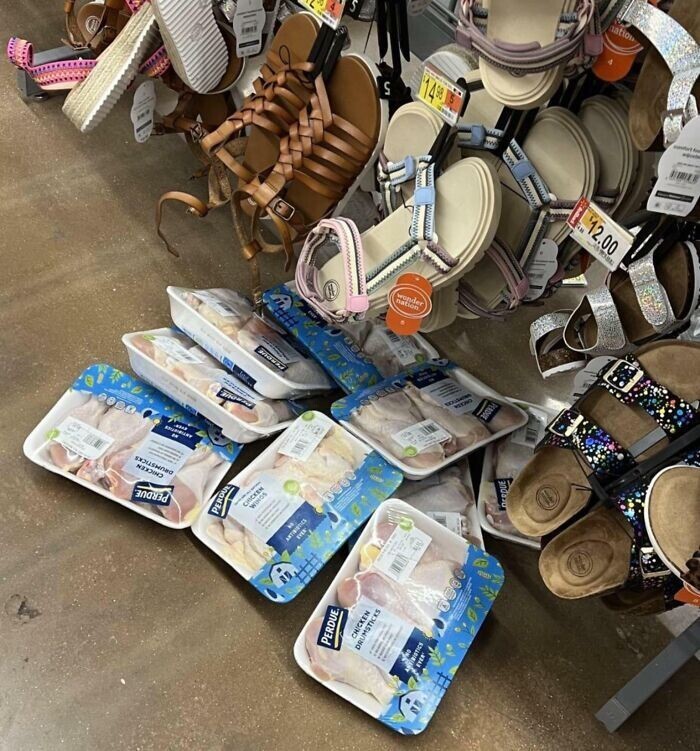 Кто-то выложил курицу из тележки посреди супермаркета. Люди, не делайте так!