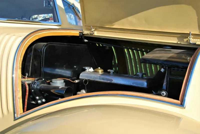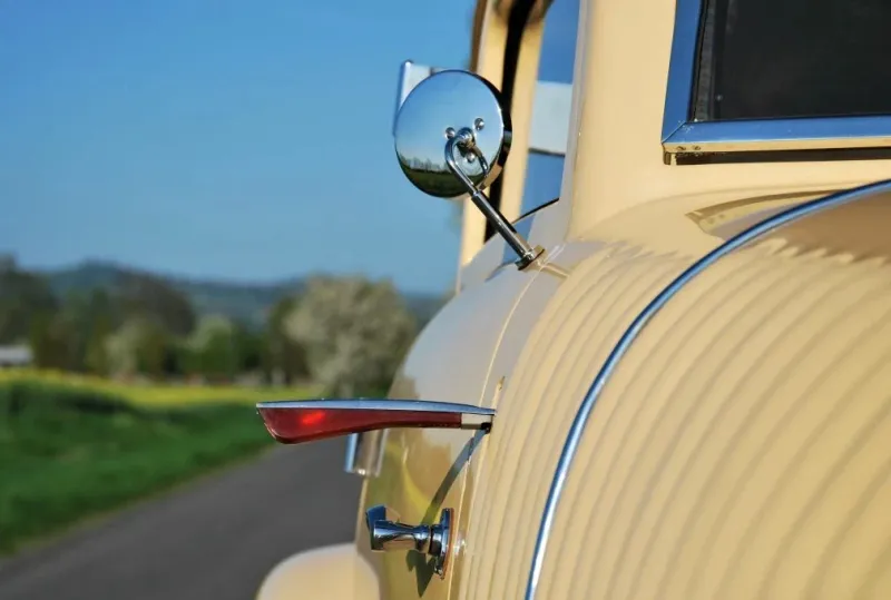 У машины есть штатные указатели поворота. Спереди они выполнены в виде откидывающихся флажков. Эффектное решение, такие устанавливали на дорогие машины в те времена, когда сами по себе указатели поворота были не обязательны.