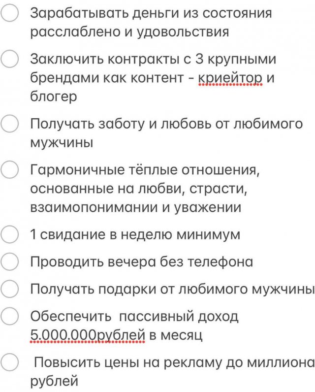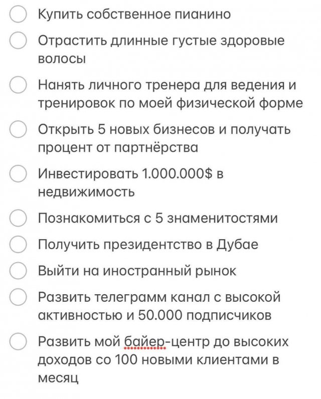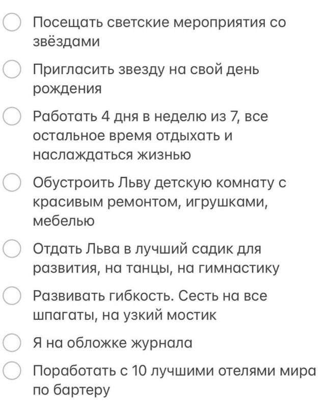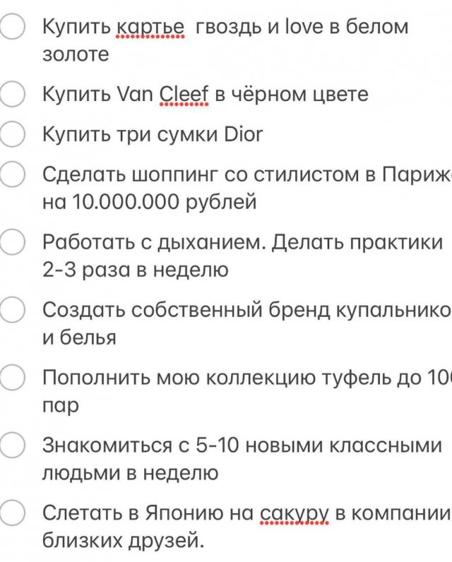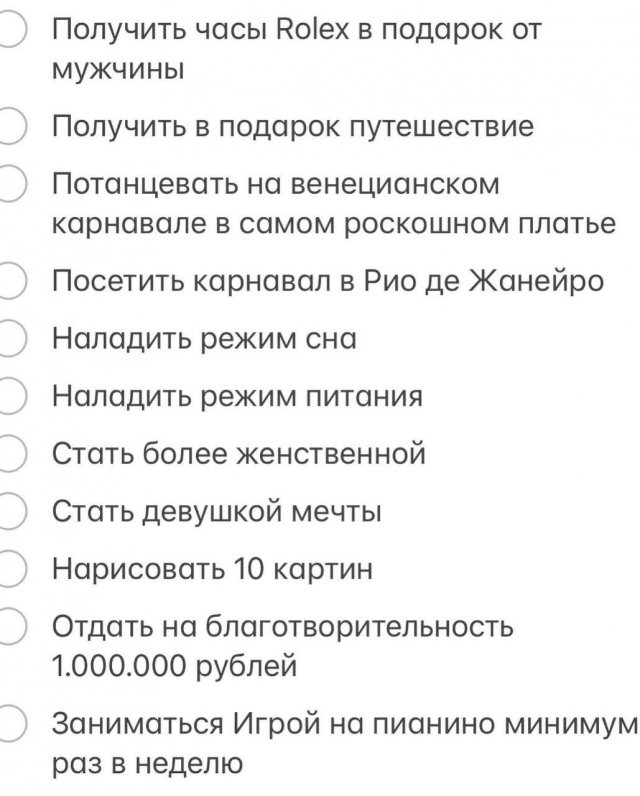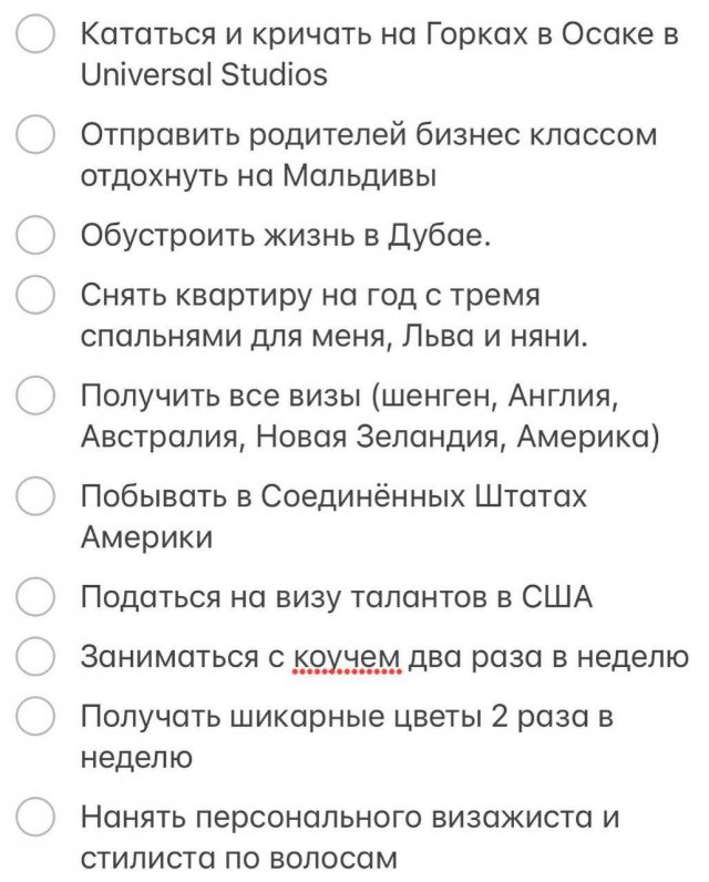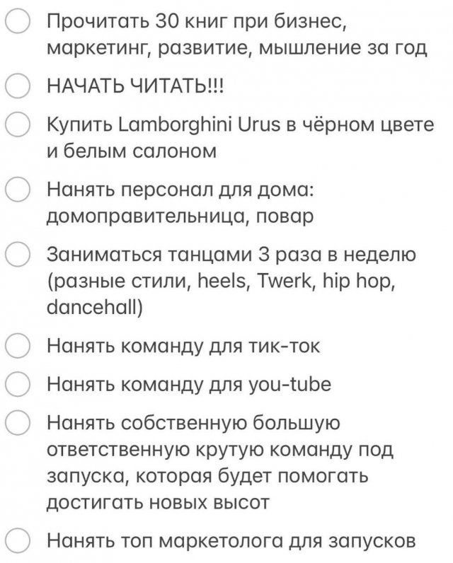 Многие блогеры, как известно, зарабатывают очень даже хорошие деньги. И некоторые из них, как эта девушка, стремятся к большему. Например, данная блогерша составила список целей (как говорят, составление такого списка помогает в их достижении). Выложила она его в своем же профиле. Многие, конечно, удивились такому обилию желаний, однако все это, как считают многие, вполне выполнимо. Как считаете?