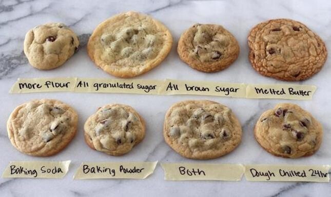 Слева направо: верхний ряд - больше муки; только белый сахар; только коричневый сахар; растопленное масло. Нижний ряд - пищевая сода; разрыхлитель теста; оба этих ингредиента; тесто охлажденное в течение суток перед выпечкой.