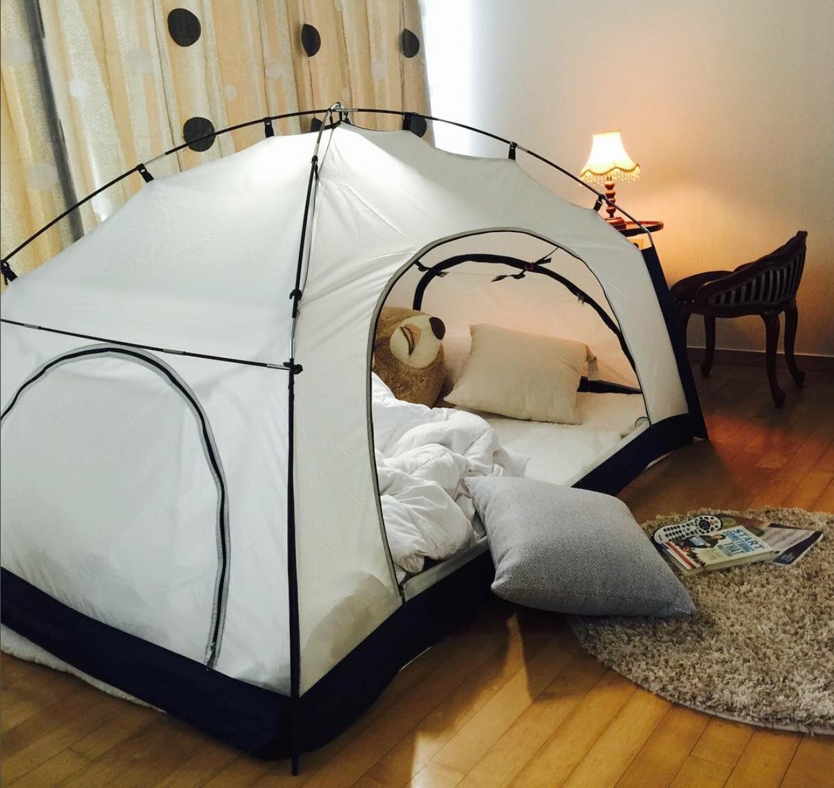 А в некоторых избушках и вовсе — палатки. И я сейчас не шучу: по сети уже несколько лет гуляют фотографии того, как жители Южной Кореи ставят у себя в домах самые настоящие походные палатки разных цветов и размеров. Под такими фото обычно разворачиваются настоящие баталии на тему того, зачем и как это делается: кто-то предполагает, что так сушат палатку; кто-то, что так развлекают детей (мы ведь тоже делали шалаши из подручных средств); а кто-то и вовсе говорит о курсах молодых скаутов.