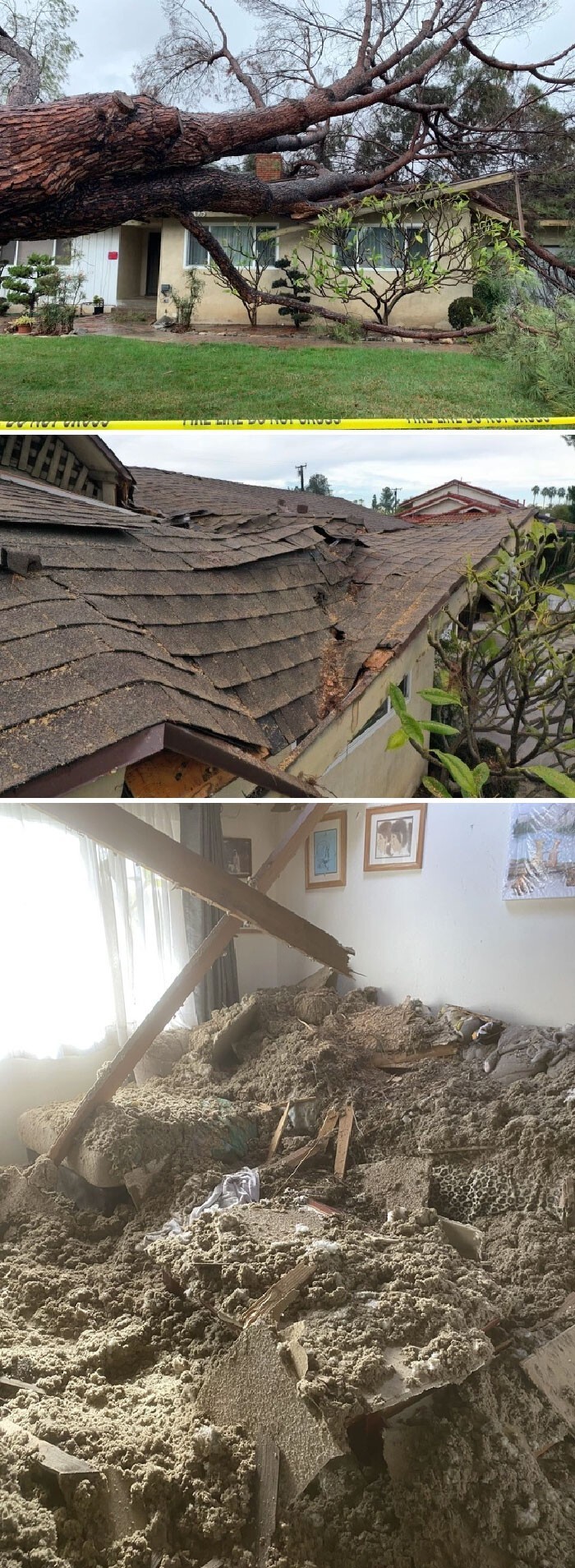 14. Во время грозы на дом упало дерево. К счастью, никто серьезно не пострадал, хотя домовладелец сидел на своем диване, когда потолок рухнул. Диван где-то там внизу под завалами