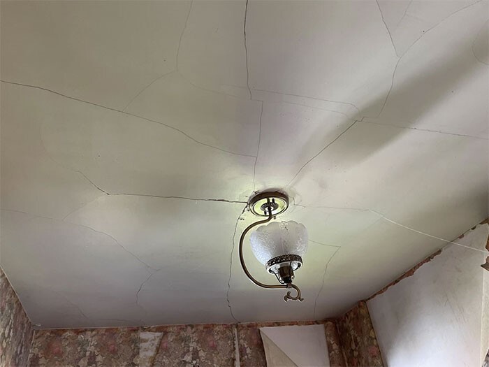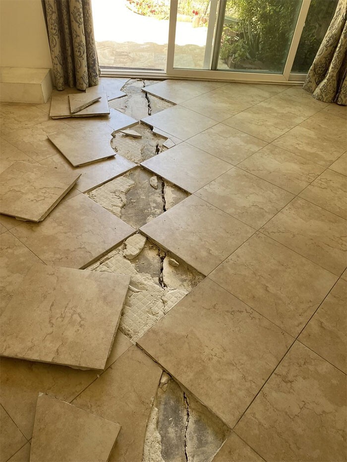 7. Этот дом затопило из-за прорыва трубы. Повреждение водой и дополнительное давление, которое она оказала на плиту, вызвали образование серьезной трещины в бетоне по всей длине гостиной