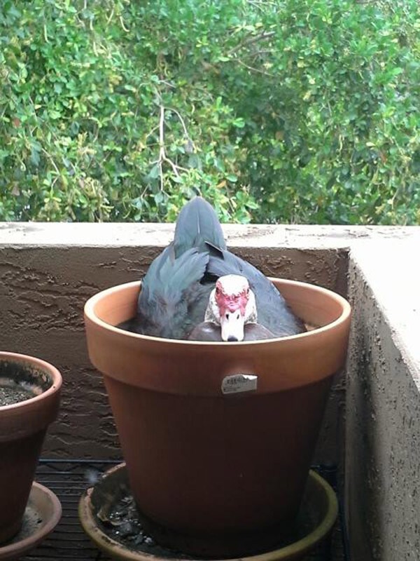 Когда они чуточку подросли, мать решила "переехать", и увела детей из горшка в другое место. Наверняка, утка очень благодарна людям за то, что её приняли, и все её малыши благополучно вылупились в безопасном месте. Не просто так мать выбрала именно этот горшок. Вот такая чудесная история!