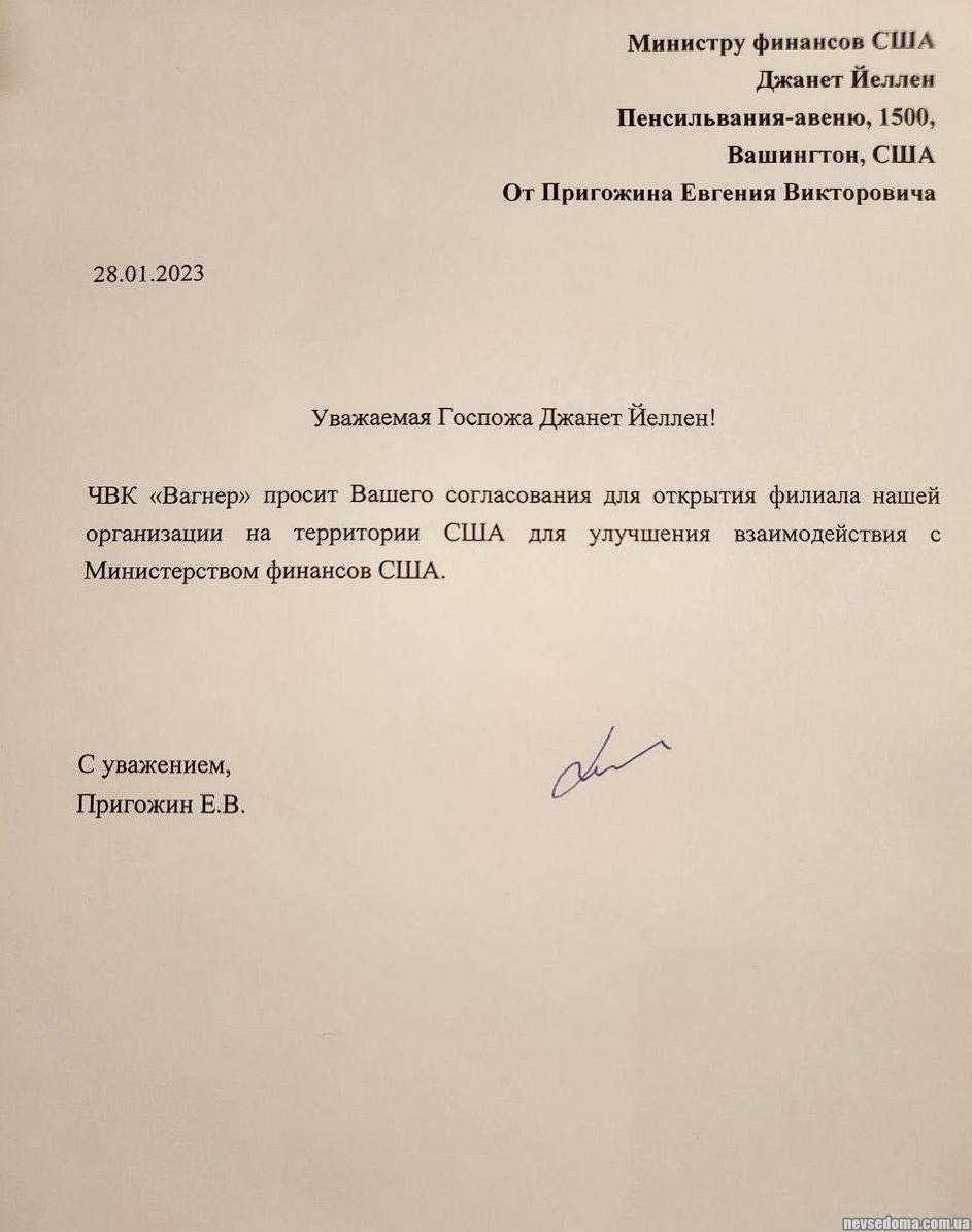 «ЧВК «Вагнер» просит Вашего согласования для открытия филиала нашей организации на территории США для улучшения взаимодействия с Министерством финансов США».