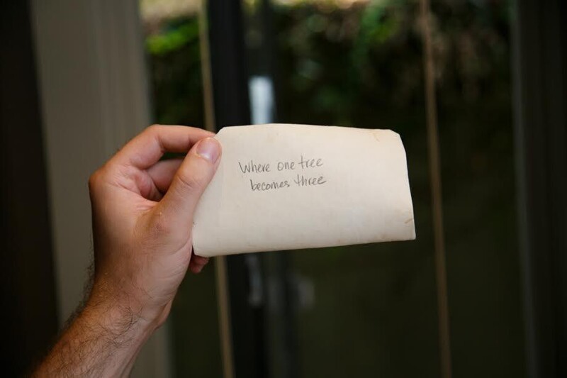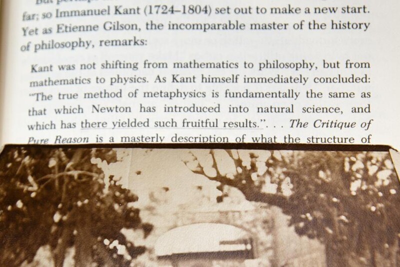 В книге также обнаружилась вложенная фотография, на обратной стороне которой было написано: «Где одно дерево становится тремя».