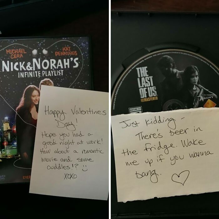 8. "С Днем Валентина! Надеюсь, хорошо поработал! Как насчет романтичного фильма и обнимашек? Ладно, шучу. В холодильнике пиво. Разбуди меня, если соскучишься"