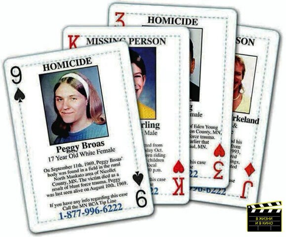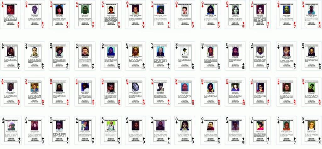 Что если создать колоду игральных карт, на лицевой стороне которых будут помещены фотографии жертв нераскрытых убийств, портреты пропавших без вести людей и снимки неопознанных тел? Кроме фото напечатать обстоятельства совершения преступления. И телефон для связи.