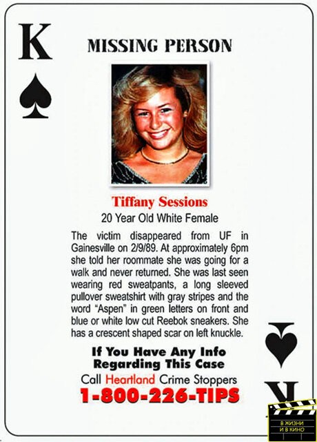 Однако не всегда полученная информация помогает покарать преступника. На карте «Король пик» (штат Флорида) помещен портрет 20-летней студентки Тиффани Сешнс, бесследно исчезнувшей в 1989 году.