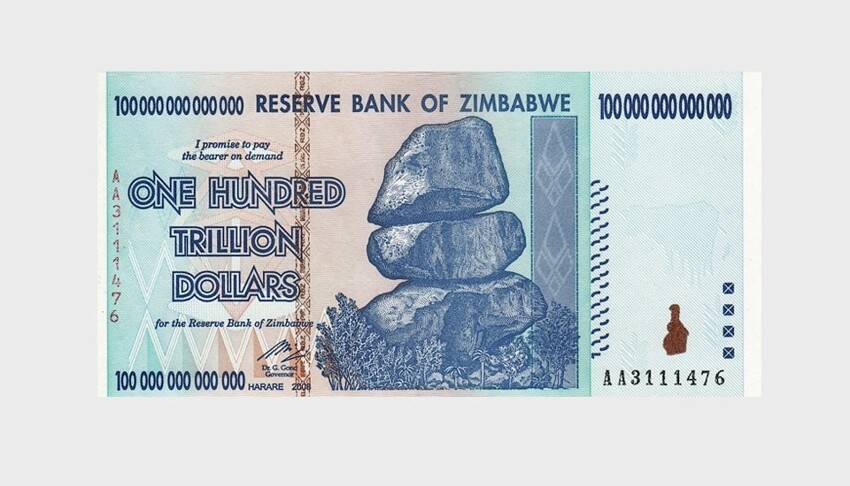 За 35 лет независимости Зимбабве инфляция лишь в первый год была ниже 10 %, а во второй половине 2008-го её высчитывали — точнее, прикидывали — числом с 23 знаками. Цены росли фантастическими темпами из-за того, что власти страны не придумали ничего лучше, чем печатать ничем не обеспеченные банкноты. Из-за этого в Зимбабве ходили купюры в сотни миллиардов и триллионов долларов, которые приходилось деноминировать чуть ли не каждый год. Выделяются изображением огромных булыжников и шрифтом в стиле логотипов рок-групп.