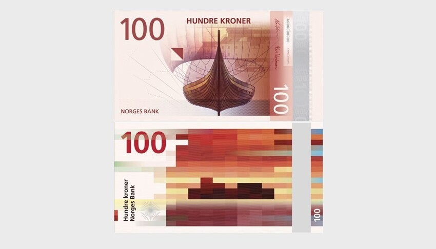 Весной Норвежский банк устроил конкурс, чтобы найти новый дизайн купюр; темой выбрали море. В финальном раунде победила студия Enzo Finger с «рябыми» макетами. Однако в кошельках северян окажутся другие банкноты. Лицевые стороны возьмут из заявки The Metric System: на них в традиционной манере изображены маяк, дракар, волна. Оборотные стороны будут «пиксельными», с абстрактными рисунками, притом чем больше номинал, тем крупнее «зерно».