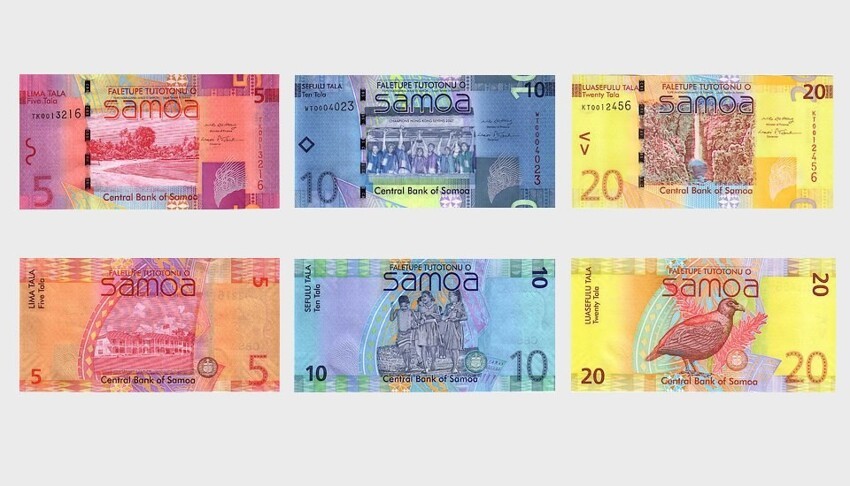 В 2008 году крошечное государство Самоа выпустило новые банкноты. На них изображены пейзажи, ребятня, сборная по регби, годом ранее выигравшая престижный турнир в Гонконге, почивший вождь Малиетоа Танумафили II, собор, здание Центробанка. Но что особенно выдаёт эмитента, так это весёлые цвета купюр: персиковый, бирюзовый, ярко-жёлтый, сиреневый, лаймовый. Словом, безмятежный край.