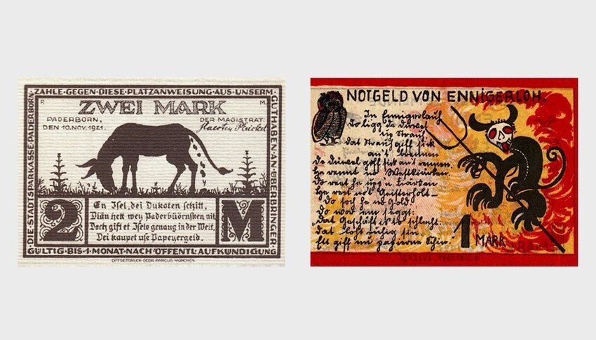 Во время и после Первой мировой войны в Германии не хватало разменных денег, а потом началась гиперинфляция. Поэтому Рейхсбанк разрешил региональные валюты — нотгельды, «вынужденные деньги». Они появились и в других европейских странах, но особенно много их было в Германии. Немецкие нотгельды выпускали местные власти и некоторые предприниматели, их делали из бумаги, фарфора, прессованного угля. Купюры тоже были затейливыми: на одних испражнялся осёл, на других скалил зубы чёрт. Они постепенно вышли из обращения после 1923–1924 годов, когда власти ввели рентную марку и рейхсмарку.