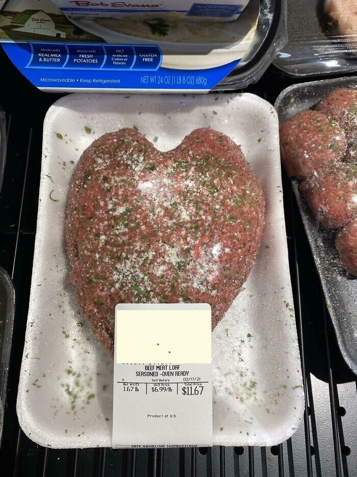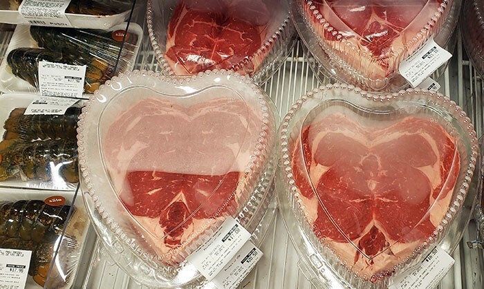 26. "В местном продуктовом магазине ко Дню святого Валентина продают куски мяса в форме сердца"