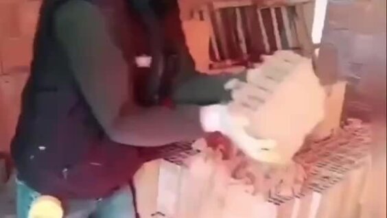 Турок показывает качество кирпичей, из которых строят дома некоторые подрядчики.