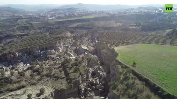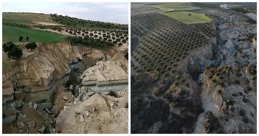 После разрушительного землетрясения в турецкой провинции Хатай образовался гигантский тектонический разлом шириной более двухсот и глубиной более 30 метров. Сдвиг почвы произошёл на оливковом роще площадью 35 гектаров и разделил деревню Тапехан надвое.