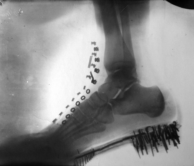 Нога Николы Теслы в обуви на рентгеновском снимке, сделанном им самим на устройстве собственной конструкции, 1896 год