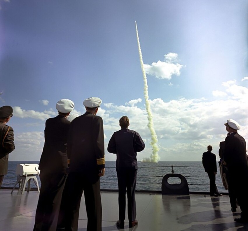 Президент Джон Ф. Кеннеди наблюдает за пуском ракеты «Поларис» с находящейся в надводном положении подводной лодки «Эндрю Джексон» у побережья Флориды. 16 ноября 1963 года