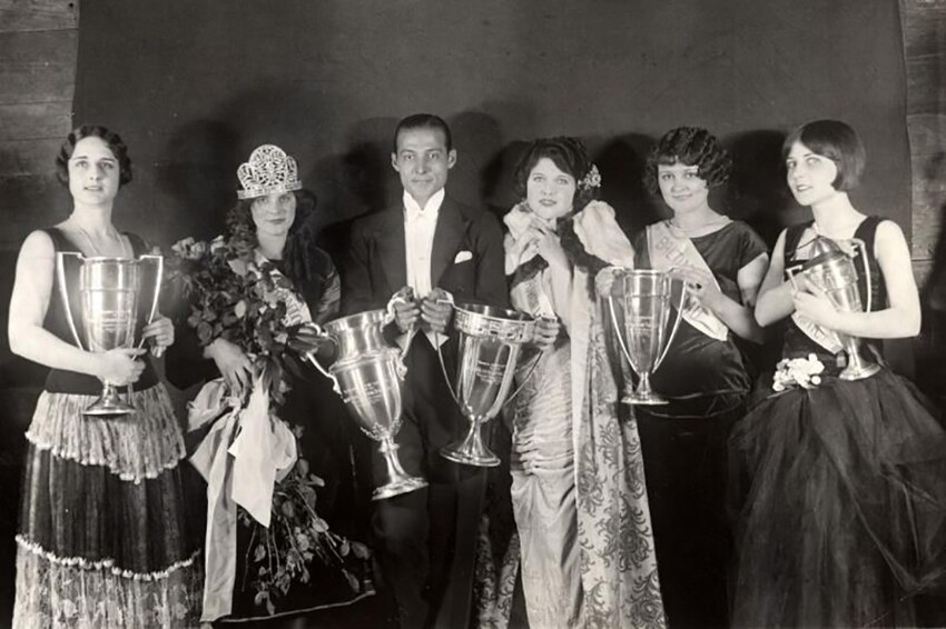 Американский киноактёр Рудольф Валентино с победительницами конкурса красоты. Сан-Франциско, 1923 год