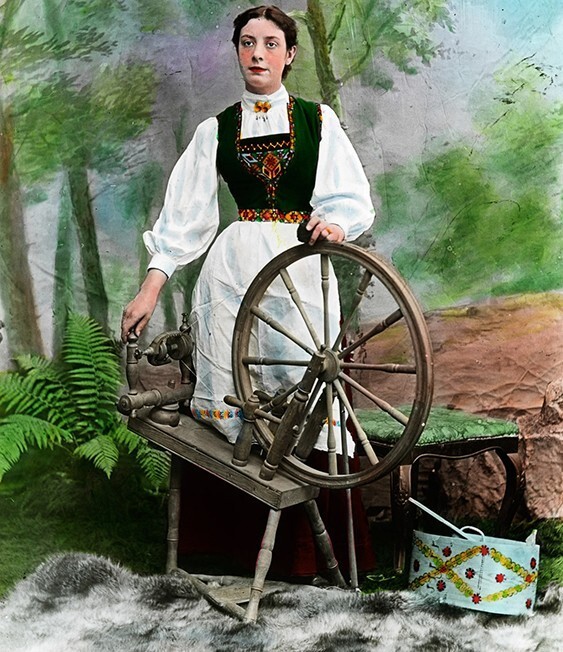 Женщина в национальном костюме с прялкой. Норвегия. 1907 год. (фото раскрашено)