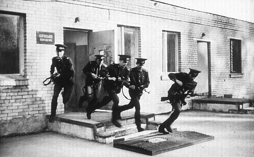 Отдыхающая смена караула выдвигается по сигналу "Боевая тревога" к месту нарушения. 1973 год