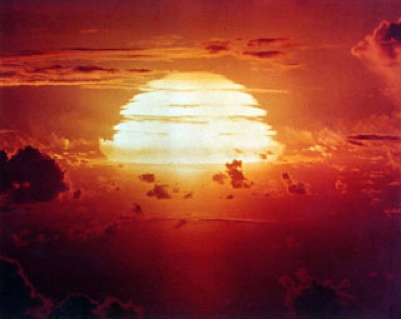 Это не фотография садящегося за горизонт солнца. Так выглядел взрыв американской водородной бомбы на атолле Эниветок. 8 июля 1956 года