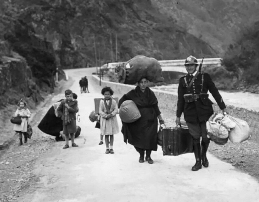 Французский пограничник помогает беженцам с испанской стороны перейти границу во время Гражданской войны в Испании. 1938 год