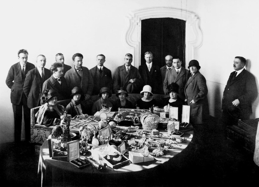 Осмотр драгоценностей императорской фамилии сотрудниками иностранных посольств и их женами в помещении Гохрана в Настасьинском переулке, с целью дальнейшей рекомендации о приобретении их правительствами своих стран. 1923 год