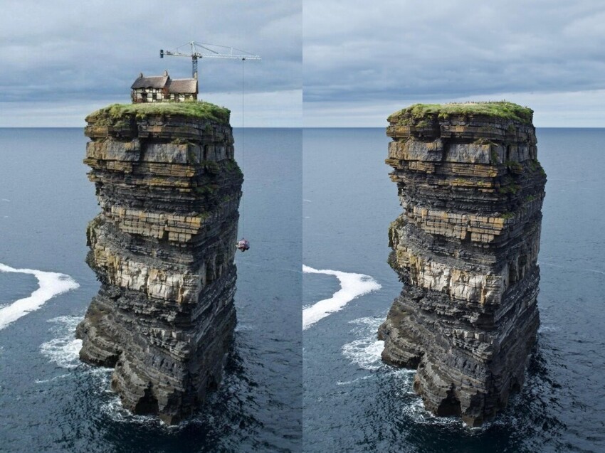 Кстати, одной из фотографий, "прославивших" Dun Briste в Интернете, стала изображение этой скалы с парой домов и подъёмным краном, якобы размещёнными наверху. Кран при этом поднимает какой-то груз. Вот сравните – судя по всему, оригинал и "фотошоп":