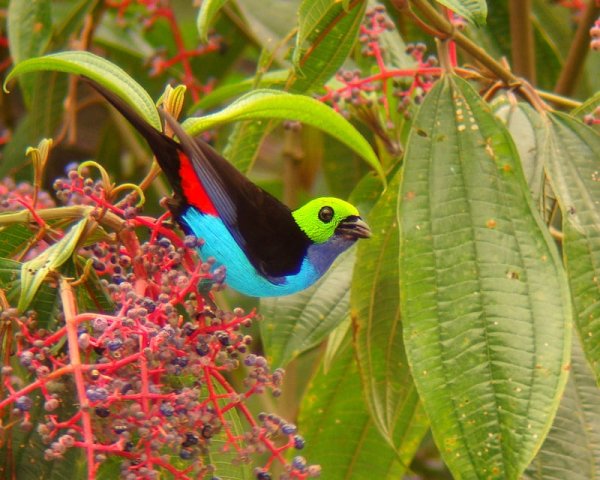Эту цветастую птичку в ярко-салатовой балаклаве можно встретить в Южной Америке.
