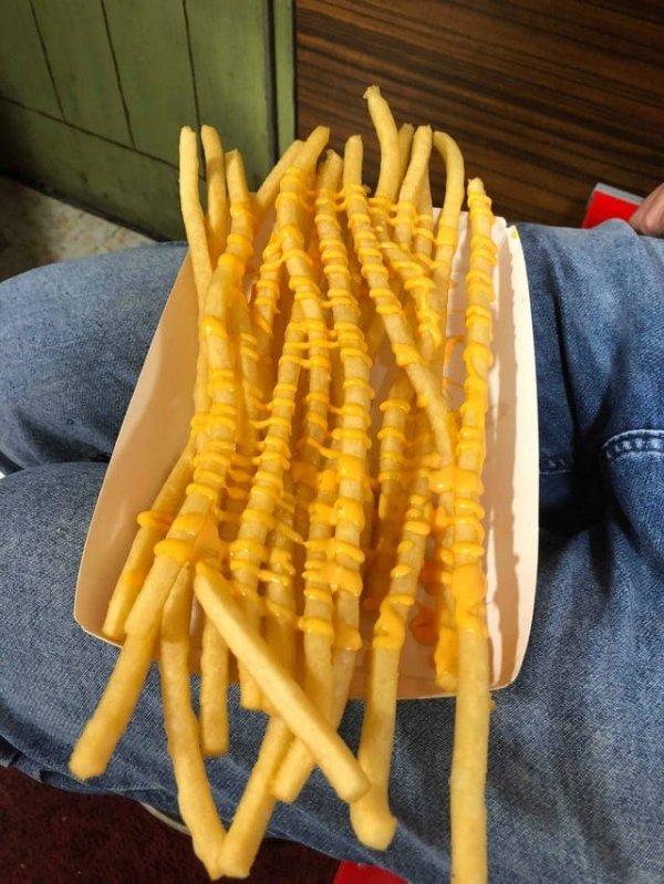 Гигантский картофель-фри с сыром, подаётся в Японии