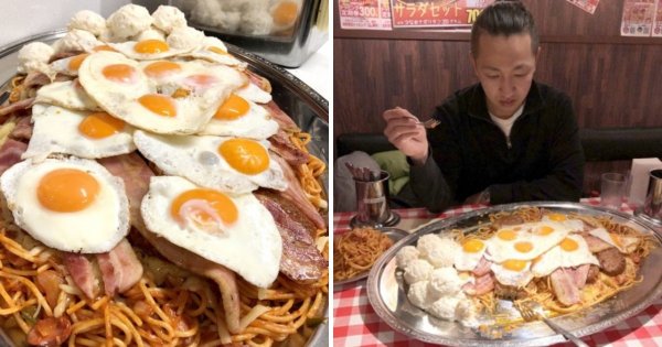 В одном из ресторанов в Токио подают блюдо под названием «Спагетти по-неаполитански». В него входят паста, 15 говяжьих котлет, 15 полосок бекона, столько же жареных яиц и порций традиционного японского картофельного салата. Готовое блюдо весит больше двух килограммов. Если гость съест такую порцию за строго определённое время, он может не платить за неё.