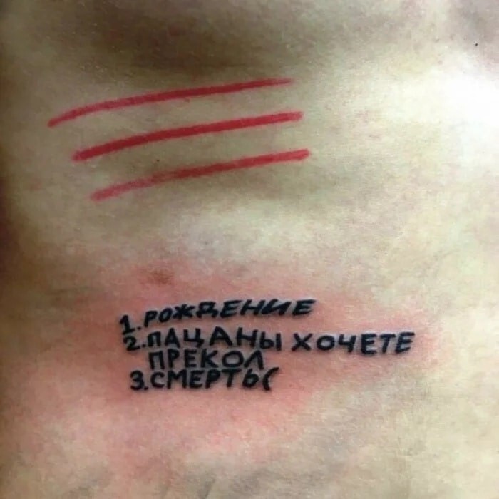 Но это совершенно не остановило ни обладателей тату из подборки ниже, ни тату-мастеров, которые эти самые татуировки и делали. В чём же была проблема? Неудачно выбранный салон? Домашний сеанс, а мастер – это только что купивший тату-машинку приятель? Алкогольное опьянение? Или просто веселья ради? Увы, этого мы никогда не узнаем.