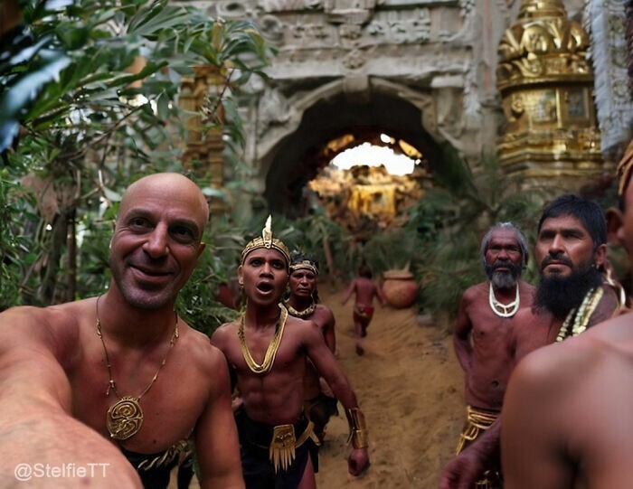 «Меня зовут Стельфи, мне 41 год. Благодаря современным технологиям Stable Diffusion я путешествую во времени и снимаю стелфи»