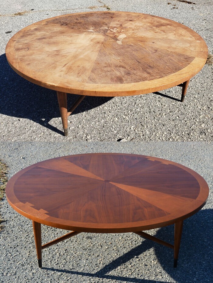 1. "Коктейльный столик Lane Acclaim 1959 года, до и после. Бедолага пережил 60 лет плохого обращения, прежде чем нашел меня. Это вдвое дольше, чем я живу. Подумать только!"