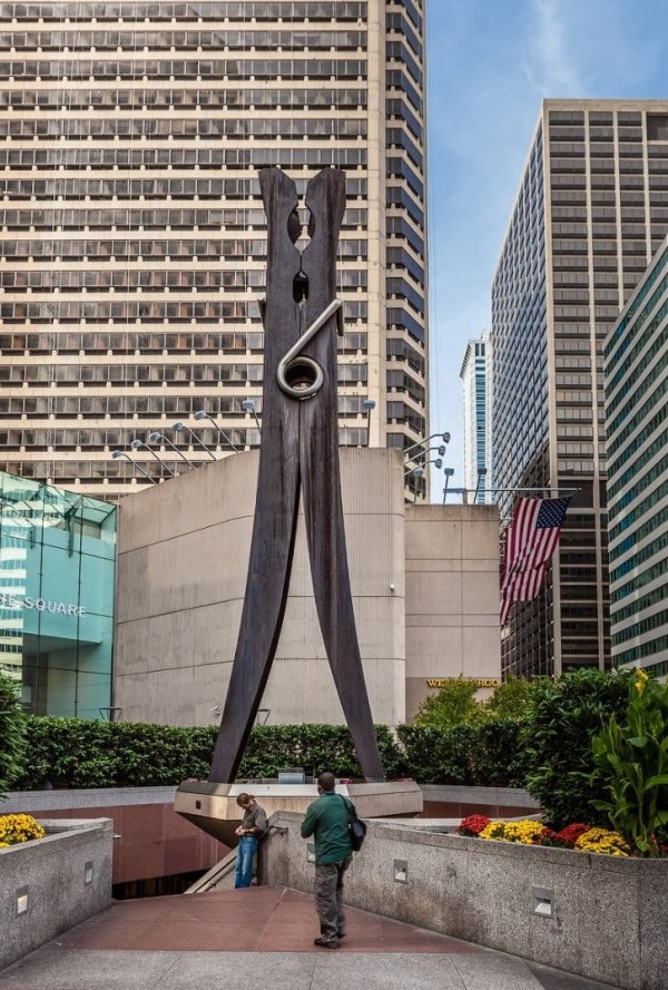 Согласно легенде, этот памятник воздвиг некий предприимчивый американец, разбогатевший на производстве бельевых прищепок. Однако на самом деле это работа скульптора Клауса Ольденбурга.