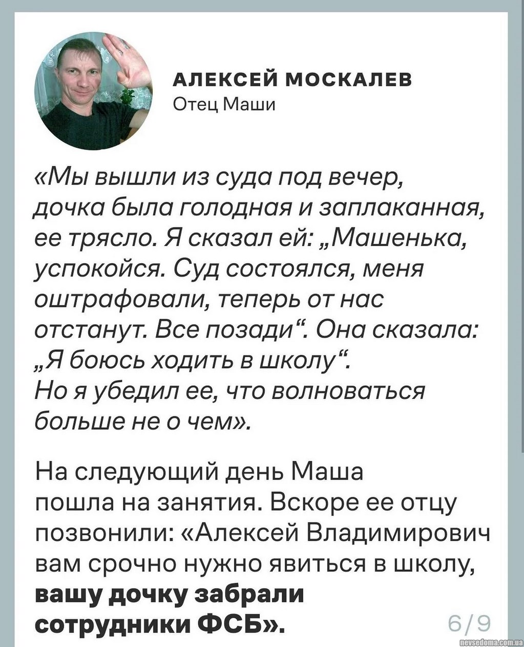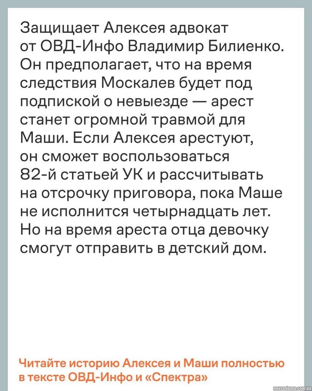 - Школьница Маша из Тульской области сделала на уроке антивоенный рисунок. После этого на ее отца - Алексея Москалева завели уголовное дело. "ОВД-Инфо и Спектр"