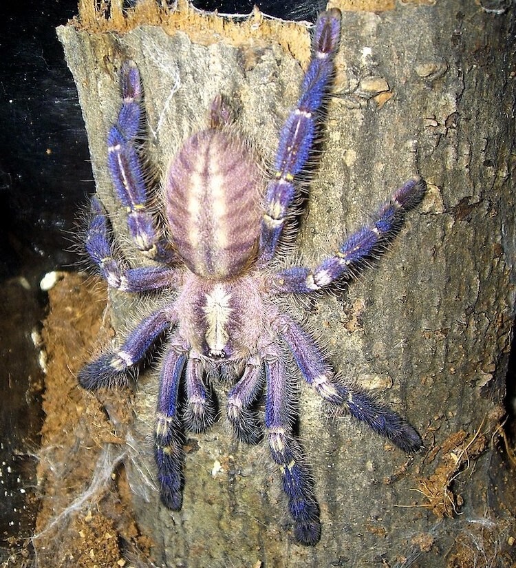 Этот необычный птицеед, покрытый шерстью металлического оттенка, считается разновидностью тарантула Старого Света. Его естественная среда обитания — лиственный лес в центральной части южной Индии, но сейчас его ареал ограничен небольшим заповедным лесом площадью 101 квадратный километр. К сожалению, среда обитания этого вида постепенно разрушается из-за лесозаготовок, в результате чего он теперь ограничен небольшим участком леса. Ультрамариновый птицеед настолько редок в дикой природе, что в 2001 году его заметили впервые за 102 года. Благодаря своему уникальному внешнему виду ультрамариновый птицеед популярен среди любителей пауков и разводится в неволе уже не менее десяти лет. Хотя нынешняя популяция неизвестна, ограниченной среды обитания и популярности среди незаконных торговцев оказалось достаточно, чтобы в 2008 году поместить вид в список находящихся под угрозой исчезновения.