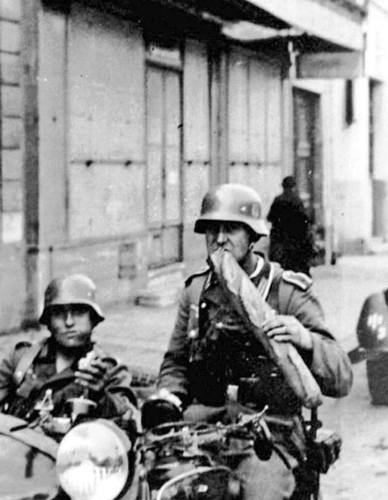 6. Немецкие солдаты питаются багетом во время вторжения во Францию, 1940 год