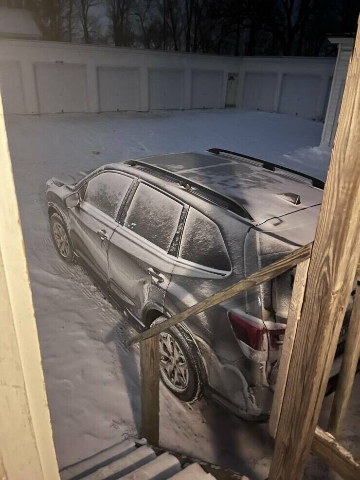 Снег прилип к машине так, что сделал ее похожей на штрихованный рисунок