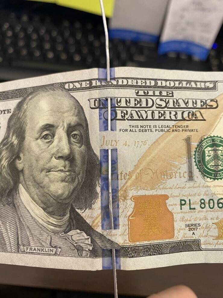 100-долларовые банкноты США имеют прорези на синей ленте для защиты от подделок