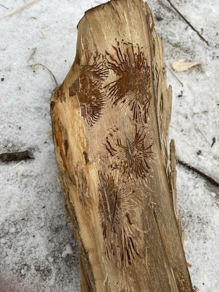 Тонкие красивые узоры, оставленные короедами