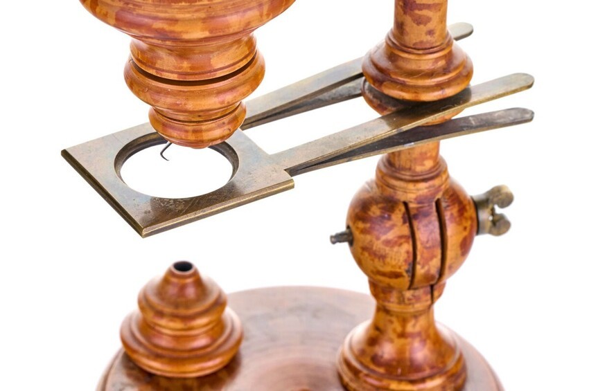 Микроскоп, который сейчас хранится в музее, был создан в 1710-х годах неизвестным европейским мастером — по образцу изобретения Гука с усовершенствованиями Маршалла. Он сделан из грушевого дерева, корпус на шарнире. Есть три сменных объектива и линза системы освещения.