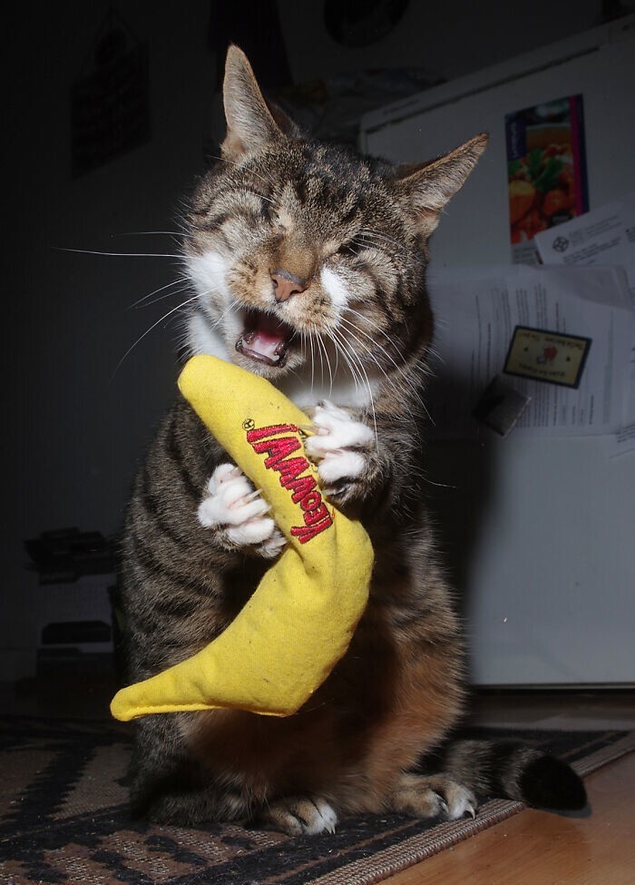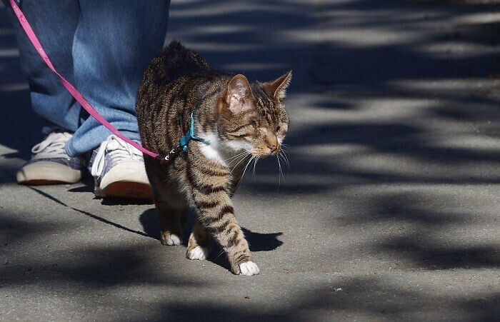 "Первый год Гертруда почти всё время проводила в спальне, где ей было комфортнее всего, и особо не выходила. Мы заботились о ней и делали всё аккуратно, избегая громких звуков, чтобы она не испугалась. Сейчас Гертруда уже ходит по дому, но иногда врезается в предметы - особенно когда нервничает," - рассказал хозяин кошки.