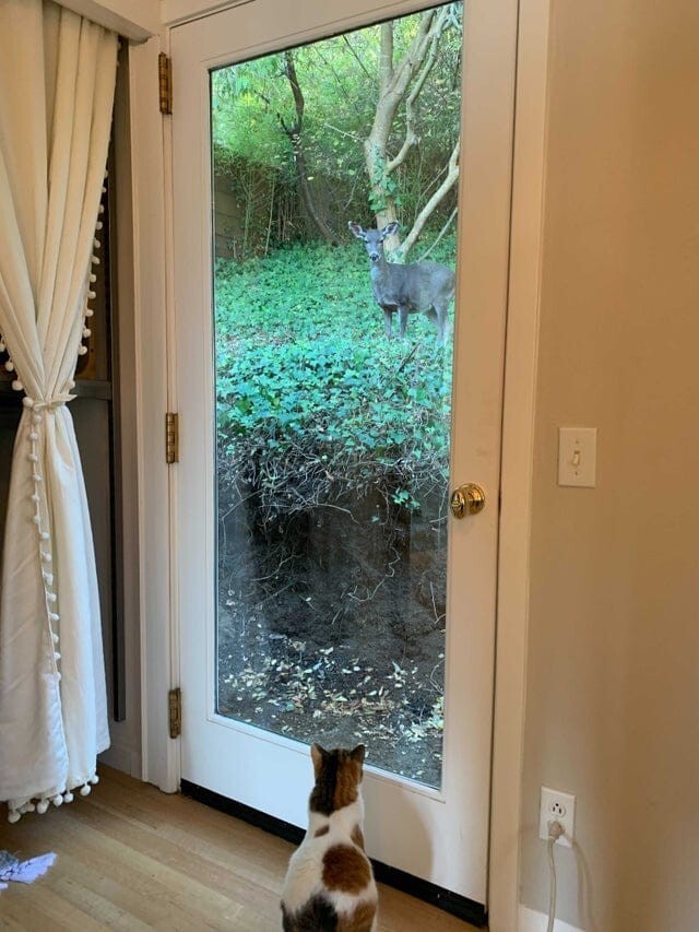 Сегодня прямо к нашей двери подошёл олень, и они с котом переглядывались 5 минут