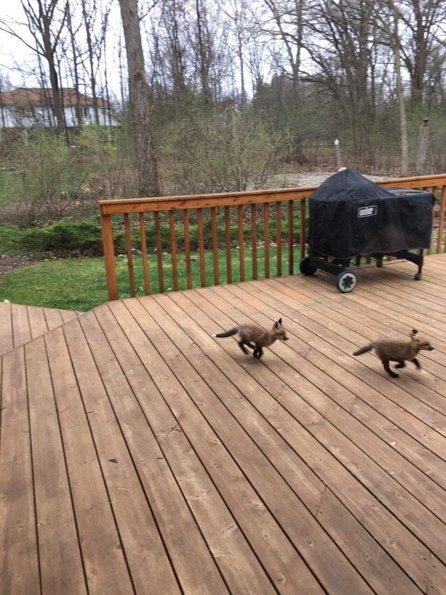 Два лисёнка играют в догонялки рядом с домой моей бабушки