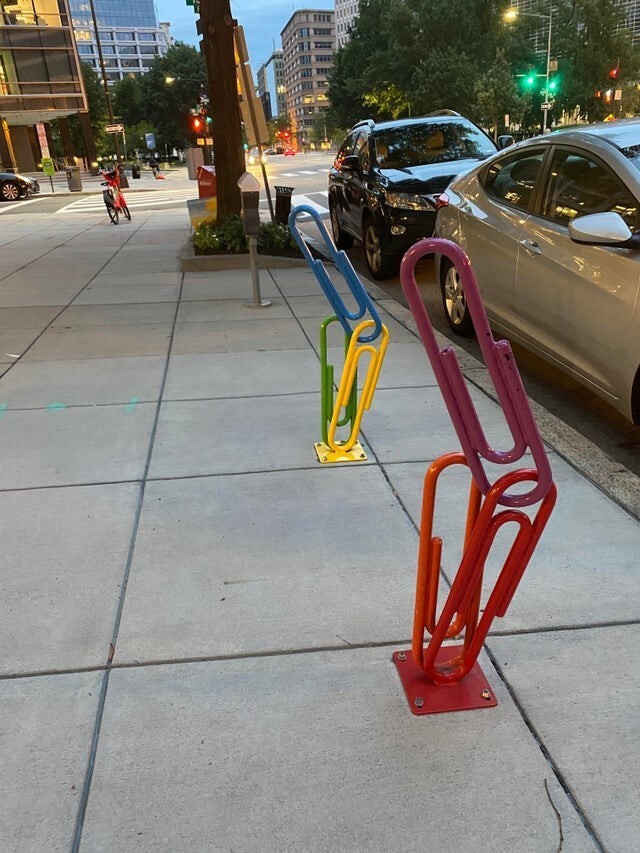 Парковка для велосипедов в виде разноцветных скрепок в Вашингтоне